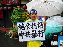 Bien qu’il pleuve, plusieurs pratiquants ont participé à l’activité. À 11h00, ils ont annoncé qu’ils faisaient une grève de la faim : « Nous avons entamé cette grève de la faim avec solennité, non seulement pour nos compagnons de pratique qui ont été persécutés à mort en Chine continentale, mais aussi pour éveiller les consciences du peuple chinois qui a été trompé par le Parti Communiste Chinois (PCC) et pour alerter les organisations et les individus qui coopèrent avec le PCC pour des intérêts temporaires ». « Vous tous, s’il vous plaît, élevez vous contre cela. Ensemble avec les pratiquants du Falun Gong, condamnons la brutalité du PCC et mettons fin à ces crimes inhumains du prélèvement des organes sur des pratiquants du Falun Gong encore vivants. Arrêtons la persécution du Falun Gong par le PCC. Puissiez-vous tous prendre cette décision juste et importante dans votre vie. »