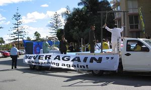 À 13 h, le 5 août 2006, avant la Troisième conférence de partage d’expérience de Falun Dafa en Australie, les pratiquants du Falun Gong du Queensland ont organisé une marche sur le Broadbeach pour protester contre la persécution de sept ans et le prélèvement des organes des pratiquants du Falun Gong encore vivants par le PCC.