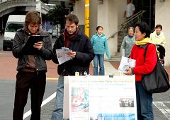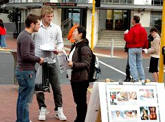 Le 11 août 2006, des pratiquants de Falun Gong de Nouvelle-Zélande ont organisé une activité au Elizabeth Square pour dénoncer les atrocités du PCC dans le prélèvement des organes des pratiquants de Falun Gong encore vivants. Les pratiquants ont distribué des dépliant de clarification de la vérité aux passants, plusieurs d’entre eux se sont arrêtés pour regardes les panneaux d’affiches anti-torture et ont demandé plus d’information. Les gens étaient bouleversés d’apprendre que le PCC persécute les pratiquants qui suivent « Vérité – Compassion – Tolérance » et ont signé la pétition demandant la fin de la persécution.