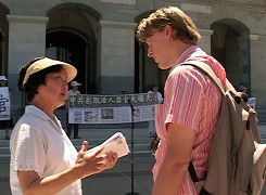 L’écrivain indépendant Roger Canfield est venu sur le site pour appuyer les pratiquants, Dans son discours, il a dit que le PCC a une longue histoire dans le prélèvement des organes dans un but lucratif d’abord les criminels exécutés et aujourd’hui les pratiquants du Falun Gong sont devenus des victimes alors qu’ils pratiquent une méditation pacifique et font quelques exercices. Il invite les gens de tous les niveaux d’avancer et de dire non au prélèvement des organes par le PCC.