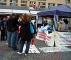 Quand la pluie a cessé de tomber de plus en plus de gens sont venus sur la place Marktplatz. Certaines personnes qui attendaient à l’arrêt du bus ont été attirées par la musique douce et fixaient de loin les panneaux d’information. Un pratiquant est allé et leur a donner du matériel de clarification. Certains passants qui passaient au loin se sont rapprochés de la « table d’opération » pour voir ce qui se passait. Les pratiquants leur ont parlé des prélèvements d’organes perpétrés par le régime communiste chinois et leur ont montré les rapports d’enquête sur le sujet. Il y avait aussi des gens qui au début semblaient indifférents et qui ont changé d’attitude en regardant la démonstration des exercices, en lisant les panneaux d’informations et en écoutant les explications des pratiquants. Quand ils ont appris qu’il y avait une collecte de signatures pour une pétition demandant la fin des prélèvements d’organes un grand nombre de personnes sont venues signer.