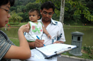 Un père portant son enfant signe la pétition. |