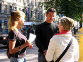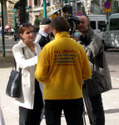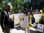 Angela, une jeune pratiquante, explique à un passant que sa tante subit la persécution en Chine parce qu'elle pratique le Falun Gong. |