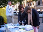 Les gens signent la pétition en soutien aux efforts des pratiquants de Falun Gong contre la persécution. |