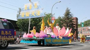 Le char des pratiquants, décoré de fleurs de lotus, était celui qui attirait le plus l’attention dans le défilé. Les fées célestes étaient assises sur le char. Les pratiquants dans des costumes dorés présentaient les exercices.