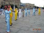Après le temps lugubre de cette dernière semaine, il s’est mis à faire beau ce jour là. Les panneaux d’information et les banderoles disposées en face d’une fontaine avaient un caractère particulier de dignité et de solennité. Les pratiquants vêtus de costumes jaune et bleu ont fait des démonstrations des cinq séries d’exercices du Falun Gong pour le public.