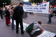 Quand un Ministre allemand a interviewé Wen Jiabao à l’intérieur de l’Hôtel de ville, les pratiquants de Falun Gong faisaient paisiblement les exercices sur la place de l’hôtel de ville. Les panneaux d’information des pratiquants ont attiré beaucoup de passants qui ont lu l'information en silence. Un pratiquant a utilisé un micro pour informer les passants de la persécution perpétrée en Chine, particulièrement des prélèvements d’organes sur des pratiquants de Falun Gong vivants. Les médias sont venues aussi filmer les activités des pratiquants.