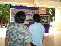 Au cours de la première journée d’exposition, les pratiquants ont donné des représentations de grands tambours, des danses de jeunes filles célestes, et ont fait une démonstration de la série des cinq exercices. Beaucoup d’étudiants ont appris la vérité à l’exposition sur le Falun Gong ainsi que les faits sur la persécution qui se continue en Chine.