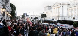 | Après le spectacle, beaucoup de gens ont continué à apprécier la « danse du lion » et la « danse du dragon » à l’extérieur du théâtre tout en attendant leurs autobus |