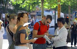 Beaucoup d'Occidentaux ont regardé le groupe de tambour de ceinture après avoir accepté les dépliants et ont demandé pourquoi le PCC persécute d'aussi bonnes personnes. « Parce que nous croyons en Authenticité-Bienveillance-Tolérance. » Les enfants qui grandissent dans des pays occidentaux savent que la liberté de croyance est un droit fondamental. Ils n'aiment pas le Communisme.