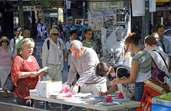 Les passants lisent les dépliants et prennent connaissance du mouvement de démissions du PCC