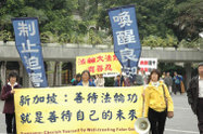 Les pratiquants de Falun Gong de Hong Kong marchent en direction du Consulat général de Singapour, pressant les autorités de Singapour de ne pas agir en complice du PCC et de mettre immédiatement fin à la persécution du Falun Gong.