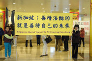 Les pratiquants ont lu une déclaration en face du Consulat général de Singapour. Ils ont condamné certains individus au sein du gouvernement de Singapour qui sacrifient la moralité et la justice pour leurs propres intérêts et qui ont à répétition abusé de leur autorité pour persécuter les pratiquants de Falun Gong afin d''apaiser le PCC.
