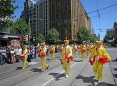 Menés par la Fanfare de la Terre Divine de Sydney, les pratiquants de Falun Gong ont présenté des danses de la dynastie Tang, la danse de l’éventail, une démonstration des exercices de Falun Gong, la danse de la Soie Colorée et un numéro de tambours de taille. En outre, la troupe de la danse du dragon et du lion des pratiquants se produisait pour la première fois en public. Les présentations joyeuses des pratiquants ont été encouragées et fortement acclamées par les spectateurs. Beaucoup de spectateurs ont levé le pouce en direction des pratiquants en guise d'appréciation.