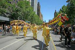 Une cérémonie au drapeau a eu lieu avant le défilé. David de Kretser, gouverneur de Victoria, a prononcé un discours lors de la cérémonie. Le gouverneur et les VIP ont ensuite regardé le défilé. Plus de 60 groupes avec presque 1.000 membres revêtus de leurs costumes ethniques colorés ont défilé dans le centre ville de Melbourne. Le groupe des pratiquants de Falun Gong était le plus grand parmi tous les groupes participants.