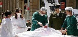 Reconstitution dénonçant le prélèvement des organes des pratiquants du Falun Gong encore vivants pour faire du profit.
