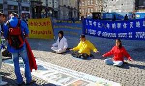 Les pratiquants danois ont déployé des bannières avec les mots "Falun Dafa est bon", " Donnons nous la main et mettons fin immédiatement à la persécution" et "Arrêtez immédiatement les huit ans de génocide." En même temps, des photos ont été exposées racontant la propagation de Falun Dafa dans le monde et comment les pratiquants sont torturés en Chine. Au son d'une paisible musique, quelques pratiquants faisaient la démonstration des cinq séries d'exercices et d'autres distribuaient une information aux passants. La scène pacifique et sereine a attiré beaucoup d'attention.