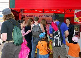Pendant le festival, le stand des pratiquants était situé dans le centre de Birmingham. Les pratiquants ont distribué une information et fait la démonstration des exercices pour les festivaliers qui entouraient le stand, les gens se sentaient manifestement concernés et l'attitude des chinois envers l'information avait aussi significativement changé depuis l'an dernier. La plupart des gens étaient heureux de recevoir l'information ; nombre d'entre eux ont souhaité la réussite de l'appel pacifique des pratiquants de Falun Gong contre la persécution. De nombreux chinois se sont arrêtés en face de notre stand, regardant la démonstration des exercices et écoutant attentivement les explications des pratiquants avant de prendre une copie de l'éditiorial d'Epoch Times, Les Neuf commentaires sur le Parti communiste, à ramener chez eux. Un pratiquant a vu quatre jeunes étudiants chinois devant le stand et leur a donné un VCD d'information et les Neuf commentaires en chinois, c'était à qui prendrait l'exemplaire le premier.