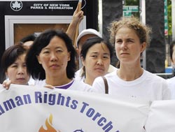 « Pourquoi ce qui se passe en Chine nous importe ? » Susan Prager, directrice RP pour le Relais de la Flamme des Droits de l'Homme, a défié le public. « Y a-t-il un lien quelconque entre les jouets qui ont été rappelés, la nourriture avariée et la persécution des droits de l'homme ? Tous ont leur origine dans la même culture corrompue, qui ne prête aucune attention à la vie. »
