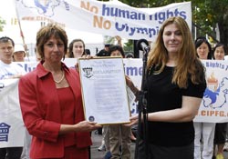« Au début de cette année, le PCC a lancé une rafle des pratiquants de Falun Gong. Plus récemment, il a arrêté Gao Zhisheng, l'avocat des droits de l'homme renommé. En outre, il a été rapporté que pendant les Jeux Olympiques, le PCC refusera l'entrée à beaucoup de gens qui ont été classifié dans 13 catégories indésirables. »