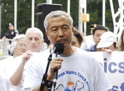 Dr Zhiyuan Wang, directeur de l'organisation mondiale pour enquêter sur la persécution du Falun Gong (WOIPFG), a dit lors du rassemblement : « Quand la Chine a été choisie pour recevoir les Jeux Olympiques en juin 2001, une condition était que le PCC améliore les droits de l'homme en Chine. Mais alors que Pékin a été choisi, la situation des droits de l'homme en Chine continue à se détériorer. »
