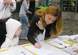 Les bénévoles du bureau mondial ont mis en place des panneaux de clarification des faits et des photos. Malgré la pluie, beaucoup de gens sont venus regarder et lire l'information et ont signé leurs noms. Les gens étaient choqués par la brutalité du PCC révélée par les photos et les autres documents.