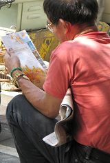 Un passant lit le dépliant sur « L’exposition artistique internationale de Vérité – Compassion – Tolérance ».