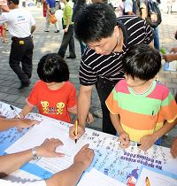 Les gens venaient en un flot continu signer la pétition pour soutenir le Relais de la Flamme des droits de l'homme