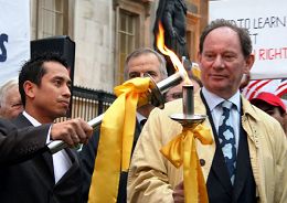 Dans l’après-midi du 25 octobre 2007, le Relais Mondial de la Flamme des Droits de l’Homme est arrivé à Londres. Le Vice-président du Parlement Européen Edward McMillan-Scott a présidé une conférence de presse au Club de la Presse Etrangère et a prononcé un discours à Trafalgar Square, avec d’autres politiciens et représentants d’organisations des droits de l’homme. C'était la dernière étape du Relais de la Flamme des Droits de l’Homme en Europe avant l'Australie.