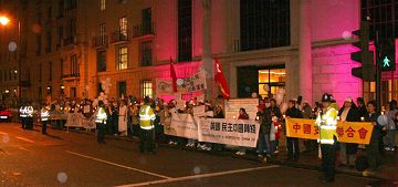 Après la cérémonie, le relais a commencé. Le groupe du relais, guidé par la police, a marché à travers les rues principales du centre de Londres, St. Martin Square, Leicester Square, Charing Cross, et Oxford Street, arrivant devant l’ambassade chinoise. Une veillée aux chandelles s’est tenue là.