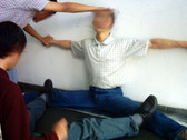 Les pratiquants de Falun Gong Liu Wei (à gauche) et Wang Zhen (à droite) racontent la torture dont ils ont fait l'expérience parce qu'ils dénonçaient la persécution du régime chinois visant le Falun Gong .Wang Zhen montre comment il a été torturé par d'autres détenues dans les camps de travail chinois. D'autres détenus lui ont donné des coups de pied dans les jambes en les écartelant au maximum. Ses ligaments et ses jointures ont souffert au point qu'il ne peut plus se tenir debout depuis, mais ils l'ont quand même forcé à passer la serpillière en s'agenouillant par terre.