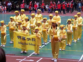 “Un esprit et un corps sains ont beaucoup participé à améliorer leur performance dans plusieurs aspects à l’école. A l’école, ces enfants doivent traiter les autres et tous les sujets avec Vérité, Compassion et Tolérance. La troupe de Tambourins de ceinture fait partie du programme d’art et de talent de l’école Minghui. La musique qu’ils jouent est tirée de la culture traditionnelle chinoise " a ajouté le présentateur.
