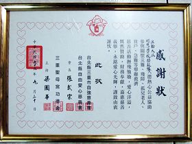 Certificat d’appréciation de la Fondation de Charité de Ziqiang discerné à la Troupe de Tambourins de ceinture de l’école Minghui après qu’ils aient joué lors de la cérémonie de leur 30ème anniversaire en septembre 2007. |