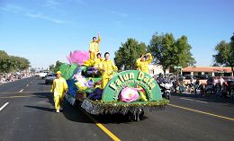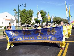 Le défilé a commencé à 9 h. En tête du groupe de pratiquants de Falun Gong se trouvait une grande banderole disant: « Falun Dafa ». Six drapeaux avec les symboles du Falun suivaient la banderole. Quatre pratiquants faisaient la démonstration des exercices debout sur le char allégorique et un pratiquant était assis en méditation dans une fleur de lotus. Un char de NTDTV suivait le défilé, faisant la promotion du Spectacle du Nouvel An chinois à Phoenix.