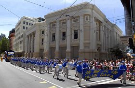 Le Défilé annuel de Noël a démarré à 14h le 17 novembre 2007 à Wellington, capitale de la Nouvelle Zélande. Il y avait 78 inscriptions cette année, et une d'entre elle était le Falun Gong (également appelé Falun Dafa). C'était leur première apparition dans le défilé et leur formation a beaucoup attiré les regards.