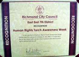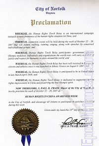 Le 26 octobre, un rassemblement s’est tenu à Richmond pour éveiller les consciences au sujet des violations des droits de l'homme en Chine. Les fonctionnaires élus et les activistes locaux pour la justice ont assisté au rassemblement afin de condamner le parti communiste chinois (PCC) qui continue sa persécution contre les chinois avant les Jeux Olympiques 2008. Le conseil municipal de Richmond du 7ème district a proclamé la semaine comme étant « La semaine d’éveil des consciences de la flamme des droits de l'homme ». Le maire de Norfolk a publié une proclamation en l'honneur du Relais de la flamme des droits de l'homme.