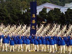À Taïwan, les pratiquants ont formé les caractères chinois pour promouvoir Dafa pour la première fois en l’an 2000, lors de la conférence internationale de partages d’expérience de cultivation de Falun Dafa tenue à Taipei. Les pratiquants ont formé les mots, « Authenticité-Bienveillance-Tolérance » et « Falun Dafa » devant le monument national de Chiang Kai-shek. En mai cette année, les pratiquants ont formé les mots, « En souhaitant un Bon Anniversaire au Maître » et « 13 Mai: Journée mondiale du Falun Dafa. » Dans cette formation de mots du 1er décembre, les pratiquants ont formé des caractères encore plus compliqués et plus gracieux.