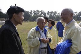 M. Ma (gauche), 96 ans, M. He (milieu), 92 ans et M. Hu Naiwen (droite), un