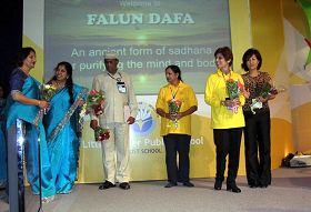 Les organisateurs de l'évènement ont arrangé que les pratiquants de Falun Gong puissent faire la démonstration des cinq exercices sur un podium. Dès que la belle mélodie des exercices s'est faite entendre, les mouvements harmonieux ont suivi et la démonstration a reçu des applaudissements enthousiastes du public. Après les démonstrations, le Principal Verkey et tous les pratiquants ont reçu des bouquets de fleurs. Les directeurs d'une vingtaine d'écoles ont invité les pratiquants de Falun Gong à enseigner la pratique dans leurs écoles. A ce jour, plus d'une soixantaine d'écoles ont exprimé leur intérêt pour la pratique, y compris plusieurs universités.