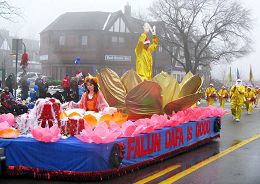 Les pratiquants du Falun Gong ont pris part à ce défilé pour la première fois et c’était le seul groupe composé principalement de sino-américains. Le char coloré, décoré de fleurs de lotus de différentes grandeurs, les tambourins de ceinture dans leurs costumes jaunes, la chanson « Falun Dafa est bon » et les drapeaux colorés où étaient écrits « Falun Dafa » et « Vérité -Compassion – Tolérance » ressortaient dans le défilé.