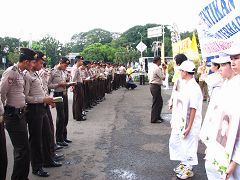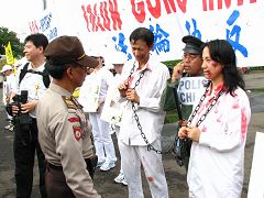 Le matin vers dix heures, les pratiquants se sont d'abord rendus au Consulat chinois à Jakarta et ont pratiqué l'exercice de méditation. Le message sur la banderole déployée appelait le PCC à mettre fin à la persécution du Falun Gong et au prélèvement d'organes sur des pratiquants de leur vivant.