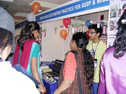 Avec l’aide des compagnons pratiquants de Bangalore et de l’Association de Falun Dafa de l’Inde, les pratiquants ont installé un stand à la conférence. Les personnes participant à la conférence, dont des libraires, des directeurs d’écoles et d'autres personnes de la communauté éducative, sont venus au stand. Les pratiquants leur ont présenté le Falun Gong et ont fait passer des vidéos qui montrent la propagation du Falun Gong à travers le monde.
