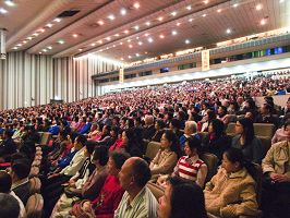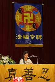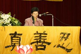 La conférence a commencé le matin. Les orateurs incluaient des personnes âgées ainsi qu'une enfant de neuf ans. Ils ont partagé leurs expériences, dont comment corriger leur parole et comportements erronés dans la vie quotidienne en prenant le principe d' « Authenticité-Bienveillance-Patience » comme guide, comment lire la Loi, bien faire les exercices et comment clarifier la vérité aux Chinois. Beaucoup de gens dans le public ont été émus aux larmes par l'excellent partage d'expérience.