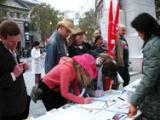 Les pratiquants de Falun Gong du Royaume Uni ont poursuivi leurs efforts pour éveiller les consciences dans le centre de Londres. Pendant plusieurs week-ends consécutifs, à St Martin Square, juste à côté de Trafalgar Square, ils ont exposé des photos, démontré les cinq séries d’exercices du Falun Gong, distribué une information et collecté des signatures. Souhaitant que plus en plus de gens au Royaume Uni connaissent le Falun Gong, soient informés de la persécution endurée par les pratiquants en Chine continentale et puissent signer la pétition appelant à la fin de la persécution. Un flot continuel de gens venant de toutes les directions est passé devant la banderole « Le Falun Gong est persécuté en Chine ». De leurs courtes conversations avec ceux qui s’arrêtaient pour lire l'information affichée et signer la pétition les pratiquants ont réalisé que de plus en plus d’Occidentaux connaissaient déjà la vérité à propos du Falun Gong. Ils sont nombreux à condamner la persécution de différentes manières et ont ainsi choisi pour eux même un bel avenir.