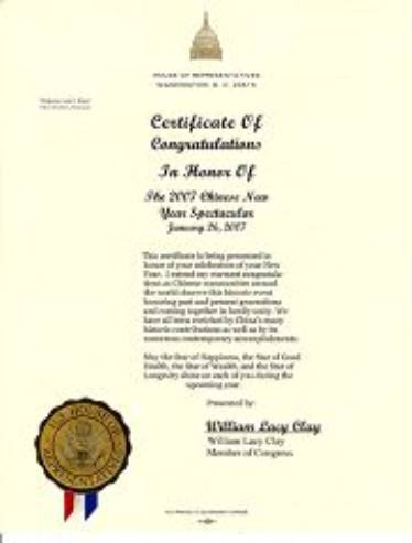 Le député William Lacy Clay a envoyé un certificat de félicitation au Spectacle du Nouvel An chinois.