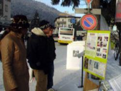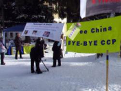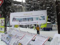 Le mercredi, le Forum économique a commencé officiellement. Des gens de toutes professions se sont rassemblés à Davos. Plus de cent médias étaient présents. La banderole suspendue au dessus du stand des pratiquants, les panneaux d’information exposant la persécution du Falun Gong en Chine et la courte présentation des Neuf commentaires sur le Parti communiste en anglais et en chinois ont été filmés par les journalistes. Une TV espagnole qui avait déjà fait un reportage sur le stand du Falun Gong l’année dernière a fait une longue interview des pratiquants cette année aussi. Des pratiquants de France ont saisi l’occasion pour clarifier la vérité au monde à travers les médias de différents pays en leur disant ; « S’il vous plait soyez conscient de l’inhumaine persécution qui se déroule actuellement en Chine ainsi que de la vague de démissions du PCC qui obtient de plus en plus de soutien et d’attention. »