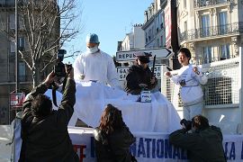 De nombreuses personnes en apprenant la vérité se sont attroupées pour demander des documents sur le sujet. De nombreux médias et individus ont pris des photos de la simulation de torture. Un grand nombre ont dit que cette façon de révéler la persécution, montrant directement les crimes, était très efficace. Une mère et sa fille n’ont pas cessé d’applaudir pour encourager les pratiquants lors de leur passage dans le défilé. Quand le défilé s’arrêtait beaucoup de personnes s’approchaient pour lire attentivement les textes et disaient « merci » aux pratiquants. Un jeune garçon français en écoutant les explications qui sortaient du porte voix a dit à ses amis : « Le Falun Gong ne ment jamais ».
