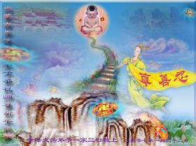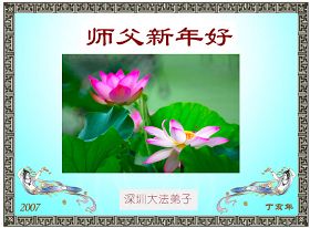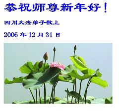 | Les mots dans l'image : Dans cette nouvelle année, les pratiquants du groupe d'étude envoient des vœux au Grand Maître. Nous nous rappelons de notre responsabilité, nous regardons en nous, nous nous cultivons, aidons le Maître à faire la rectification par la Loi, sauvons les êtres vivants et avançons plus diligemment. Heshi 21 janvier 2007 |