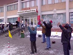 Après la conférence, les pratiquants ont organisé une démonstration des exercices du Falun Gong à l’extérieur d’un marché chinois. Dans le marché, ils ont distribué une information aux chinois ainsi qu’un formulaire spécialement conçu pour démissionner du Parti communiste chinois (PCC) et de ses organisations affiliées (la Ligue de la jeunesse et les Jeunes pionniers) afin qu'ils puissent choisir pour eux même un bon futur.