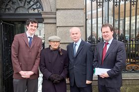 Une photo de groupe à l’extérieur du Parlement : partant de la droite, Paul Bradford président du Comité des droits de l’homme du Parlement irlandais, le député Burt Karin, M. Matas, Gerald O’Connor pratiquant de Falun Gong